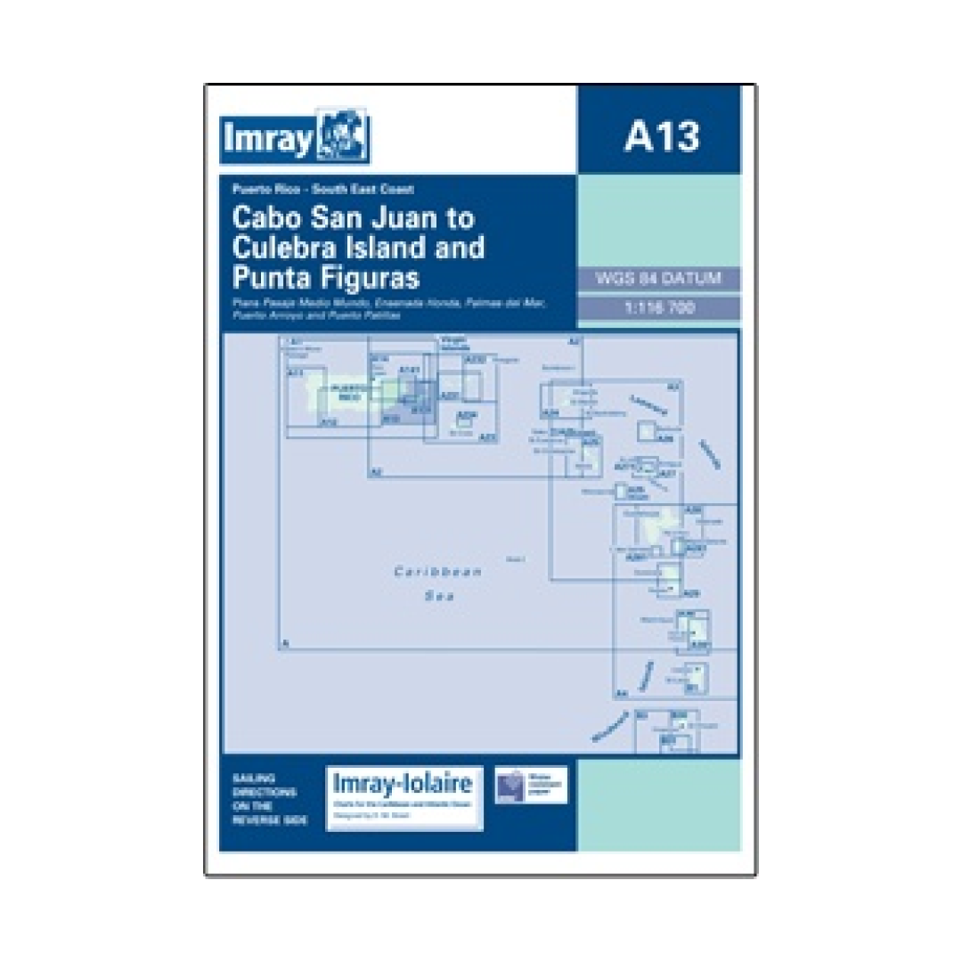 This Imray-Iolaire chart expands on the section of Puerto Rico from Cabo San Juan to Culebra Island and Punta Figuras. The chart is printed in color and uses official surveys and notes based on local knowledge. This water-resistant chart also features information on passages and anchorages as well as details of facilities for voyagers in this area of Puerto Rico.