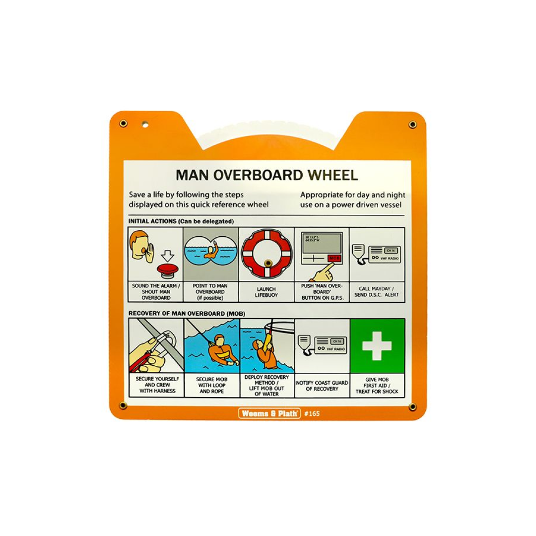 When a person falls overboard immediate action is crucial. The priority is to position the vessel near the overboard victim as soon as possible. To do this, the vessel must quickly reverse course by running a reciprocal course. A reciprocal course is putting and holding the vessel on a course that is exactly the reciprocal of the original course. The five step instructions for this maneuver are easy to follow with the use of the compass dial on one side of the Man Overboard wheel.