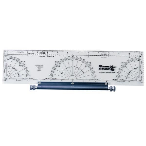 This Weems plotter is mounted on a roller that allows you to plot courses and parallel lines with simple direct transfer without the space required of traditional parallel rules or triangles. The two rollers keep the Weems plotter parallel as you slide it across the chart.